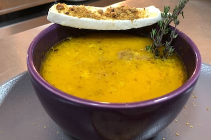 Sopa de zapallo cabutia asado y queso Brie
