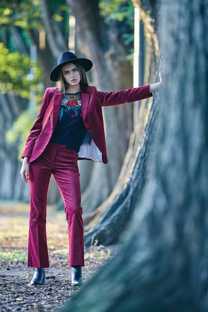 Traje de terciopelo de Giesso, top microtul con bordado floral de Tucci, botas texanas de Grimoldi