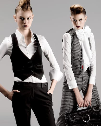 Izq.: camisa sastre blanca, chaleco de terciopelo y pantalón smoking negro (Etiqueta Negra).