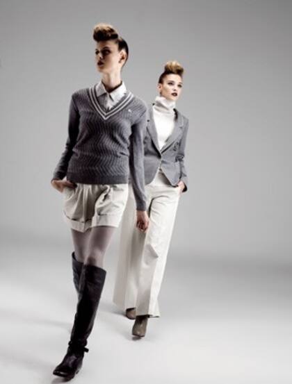 Izq.: chemise, suéter escote en V y short (todo, Lacoste), medias (Silvana), botas de caña alta (Maggio & Rossetto).