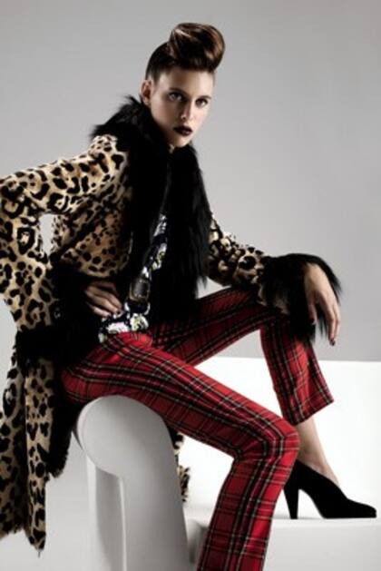 Pantalon escocés (Chocolate), remera estampada (Orb), tapado (Breeder´s), cinturón con tachas (Besha), zapatos de gamuza (Prüne)