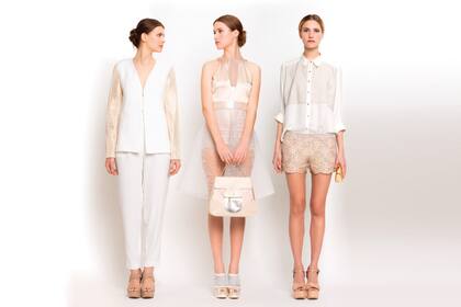 Chaqueta de brocato y rafia bordada, top de seda combinado con lazo, pantalón Oxford de brocato con bolsillos frontales, zapato de gamuza con taco y plataforma ($ 2106, $ 840, $ 2980 y $ 1940, todo, Garza Lobos)