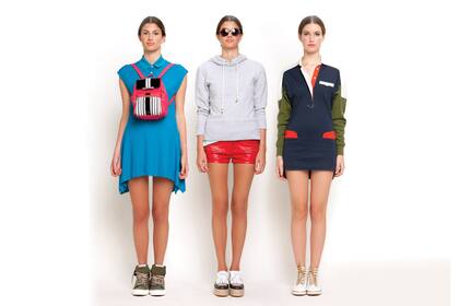 Anorak rompe vientos ($ 948, Graciela Naum), remera de algodón con detalles de encaje ($ 365, Mishka), mini elastizada con recortes azules ($ 590, Allô Martínez), sandalias con plataforma de goma rayada ($ 1290, Las Pepas)