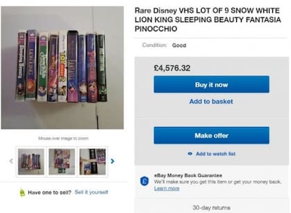 Uno de los vendedores puso a disposición su colección de diez películas de Disney, con clásicos como La Cenicienta, Bambi, Aladdin y 101 Dálmatas, entre otras y el precio de venta es de 17.500 dólares, según contó el sitio Ladbible.