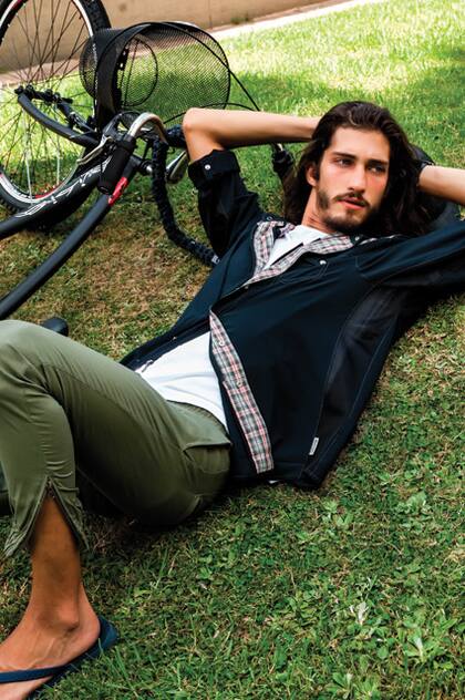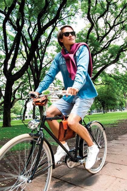 Camisa de jean ($ 408, Giesso), suéter con capucha ($ 980, Cardon), bermudas ($ 499, Lacoste), zapatillas ( $ 620, Gola), anteojos ($ 1750, Ray Ban), (cartuchera y maletín de cuero para bicis ($ 190 y $ 450, Belosophy). Bicicleta Boston con kit de cuero y farol ($ 3400, Belosophy).