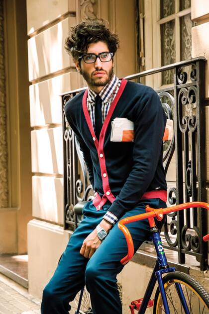 Cardigan de hilo, camisa de algodón, pantalón de gabardina, corbata de seda y cinturón de cuero ($ 599, $599, $ 799, $ 299 y $ 699, todo, Rochas), zapatos de cuero ($ 800, Etiqueta Negra), reloj (Gucci), anteojos ($ 1200, Infinit). Bicicleta Fixie ($ 2500, Canaglia).