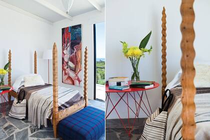 El cielo raso es de isopanel, un sistema de chapa prepintada con terminación brillante y de fácil colocación que garantiza máxima aislación, ya que es el material que se usa en las cámaras frigoríficas. Muy confortable, el cuarto expone un cuadro de Laura Sanjurjo y una cama realizada por un carpintero en madera de ciprés encerada. Completan una mesita metálica con patas tipo ‘Eiffel’ y una lámpara de chapa marroquí (todo de 3 Mundos).