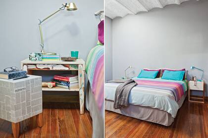 A los pies de la cama, una manta marrón chocolate (Pehache). Las mesas de luz son diferentes: a la izquierda, modelo ‘Roger’ de madera recuperada y, a la derecha, modelo- ‘Aurora’ (ambas de Talleres Sustentables). Sobre las mesitas, dos lámparas Tolomeo ‘Micro’ de la firma italiana Artemide (Manifesto). Además, una mesita adicional, algo así como una superficie de apoyo errante: ‘Cubito diario’ (Talleres Sustentables).