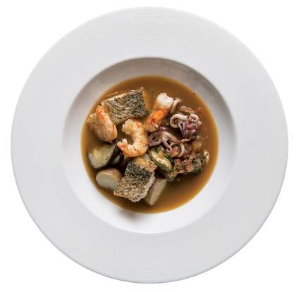 De la carta se recomienda también el pâté y escabeche de conejo (245); los arroces secos estilo español también mediterráneos –que sirven en sus paellas con el crocante socarrat–; de conejo, el auténtico; de pescado y mariscos, el de mar y vegetariano (790 a 870 para varios). Postres complejos ineludibles; para compartir, la tarta de manzana finita con helado de canela y crocante de almendras (315).