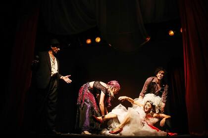 Mientras uno de los portones del lugar se abre reconozco el primer instrumento. Afuera, en la calle, suena un trombón. Se suman una tuba, un acordeón, un bombo y una guitarra. También hay gritos, de los festivos. De pronto, en la mitad del patio del Konex, aparece el auto que trae a la novia. Tiene un moño enorme en el techo. Alrededor cantan y bailan el resto de los personajes. No estoy segura de cuántos, pero creo que son más de doce. Casi todos tienen una botella de alcohol en la mano o, en su defecto, una petaca. Empiezan a dispersarse y saludar a cada miembro del público que, ahora, funciona como un invitado más del casamiento. Pienso que no quiero que ninguno de los actores se me acerque, menos que me hable. Le digo a Celeste que no hagamos contacto visual con nadie. Otra vez, pésimo timing. Con los brazos superabiertos camina hacia nosotras el que, ya me doy cuenta, hace de tío borracho -un cliché de cualquier boda, gitana o no-. Sonrío de nervios, ya es inevitable: en cuestión de segundos, con beso y abrazo incluidos, soy parte de la familia y de Rrom.