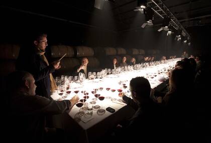 Trasladados a la bodega en Mendoza, hubo un rápido piscolabis en la casa principal, y luego fuimos llevados al inmenso galpón que aloja las barricas. Entramos casi totalmente a oscuras, hasta se podría decir que tanteando. Allí intuimos que había una larguísima mesa, donde nos fuimos ubicando libremente. De pronto, a un gesto de Hervé, se prendió una parrilla de iluminación propia de estudio cinematográfico, y apareció en todo su esplendor la mesa repleta de copas servidas, todos con vinos tintos. Y lógicamente anotador y lápiz. En una cabecera se ubicó Hervé con el joven enólogo Gonzalo Carrasco, y en la otra Nicolás escoltado por el agrónomo Gustavo Ursomarso.