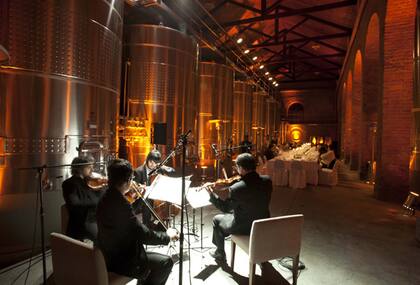 No sé si llamarlo final o segundo acto, porque fue trasladarnos todos hacia el edificio que alberga los tanques de acero inoxidable, y nos aguardaba una nueva sorpresa: una impactante mesa con candelabros encendidos donde se desarrollaría la cena. Inmensos calefactores hacían tolerable el frío externo, y oportunos reflectores volvieron a mostrar una cuidada escenografía, apoyada en la vieja construcción de la bodega, que lucía todo el esplendor de una restauración que la ha mantenido lozana.