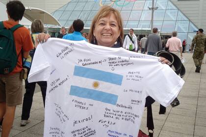 Con esa misma mirada positiva llega a la tribuna de los Juegos Olímpicos. Lleva las uñas pintadas con los colores de la bandera argentina, camisetas celestes y blancas, un cinto bordado con el nombre de la hija y hasta agua bendita por el padre Ignacio, de Rosario, a quien visitaron cuando comenzaron los problemas cervicales. Aunque el resultado no es el esperado, no dejar de sonreir cuando consuela a su hija con un abrazo.