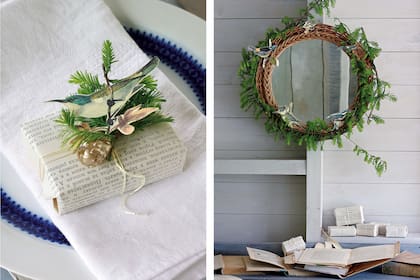 Un mínimo toque de pino verde basta para acentuar el espíritu natural de esta puesta sin brillos artificiales y comunicarle al ambiente entero un clima navideño. La lámpara se aprovechó para hacer un nido con ramas donde se posaron más pájaros de papel.