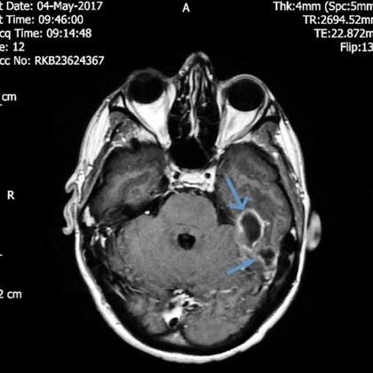 Cuando llegó al hospital, los médicos le hicieron una tomografía y las imágenes revelaron dos abscesos, o áreas inflamadas llenas de pus, en los huesos en la base de su cráneo, cerca de su conducto auditivo izquierdo. Esto indicó a los médicos que aunque la infección pudo haber comenzado dentro del canal auditivo del hombre, se había extendido más allá.