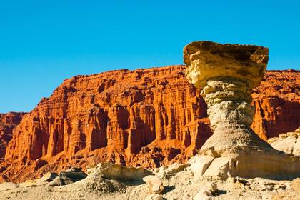 El hito siguiente es el más famoso de la provincia. El parque nacional Ischigualasto que dista a 70 kilómetros de la parada anterior. Como si fuera poco, codo a codo, se vislumbra otro parque nacional, el Talampaya, que pertenece a La Rioja, pero que confunde entre los planos levemente interrumpidos del popularmente llamado Valle de la Luna y las moles rojas riojanas.