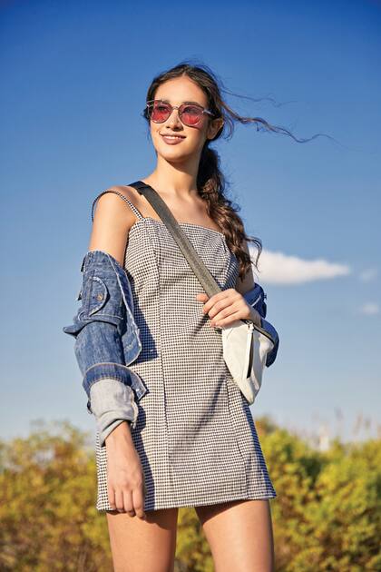 Vestido a cuadros (Como Quieres), campera de jean con perlas (Teenitas), riñonera (Prüne), anteojos de sol (Prüne)