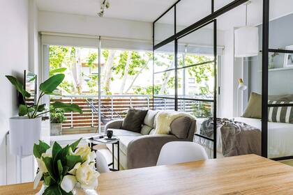 Panel corredizo de por medio, el sillón y la cama se ubicaron alineados, para que pueda ver cómodamente la tele desde ambos lugares. Los sectores están definidos y mantienen la paleta de tonos neutros. Así trazó la interioriista Victoria Kon, creadora de la marca VK Home la distribución de este monoambiente en Belgrano.