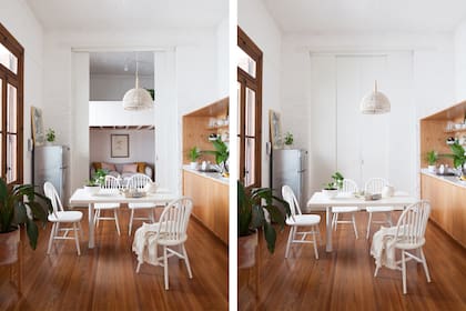 El living y la cocina se conectan con un pasaplatos que se cierra con dos puerta de saligna que la dueña de casa trajo de su hogar anterior. Una forma cálida de darle nueva vida a los materiales que la acompañaron.