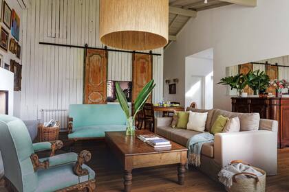 En madera de petiribí, el tabique divide el comedor de un living más íntimo y familiar, suma espacio de guardado y da soporte a la tele. Un recurso contundente y exquisito en armonía con el espíritu de esta casa proyectada y ambientada por el estudio LDMB, signada por espacios amplios, flexibles y piezas de diseño contemporáneo