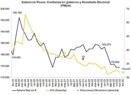 Massa sigue tratando de no escuchar estas críticas y dar una solución política al Gobierno bajando la inflación. De hecho, está convencido de que la inflación de noviembre, que vamos a conocer en estos días -él lo hace antes que nosotros- sería inferior a 6%. Hay un gráfico de Fernando Marull, uno de los economistas a los que más consultamos, que explica la relación entre la caída del salario real en pesos, ajustado por inflación, especialmente entre mayo y noviembre, y el índice de confianza en el Gobierno de la Universidad Torcuato Di Tella.