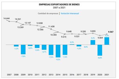 Acá tenemos el gráfico que muestra las empresas exportadoras de bienes. Por un lado, se pueden ver las exportaciones y por el otro la cantidad de empresas. El gráfico va del 2007 a la actualidad y muestra cómo el país pasó de tener 14.444 empresas exportadoras a tener solamente 9567. Nos vamos volviendo un país que no exporta. Este es el problema central de la Argentina según analizan con mucha inteligencia muchos economistas. Podemos leer los textos de Martín Rapetti, los libros de Pablo Gerchunoff. Queremos seguir teniendo el mismo nivel de vida de antes, pero generamos muchos menos dólares para sostenerlo.