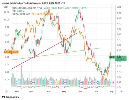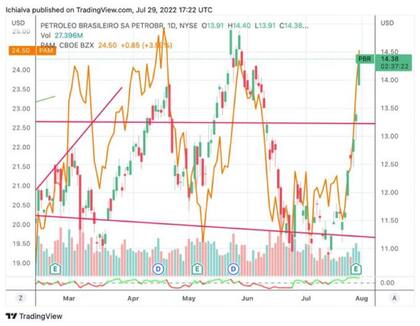 Si comparamos la acción del Banco Galicia con la del banco Bradesco en Brasil, vemos la fiesta de la que habla Massa. Aparentemente, ambas acciones se mueven juntas y en alza. Massa dice que esto fue por él. ¿Tanto impacto tiene Massa que produjo una suba extraordinaria de acciones brasileñas en Wall Street? También ocurre al comparar Petrobras y Pampa Energía.