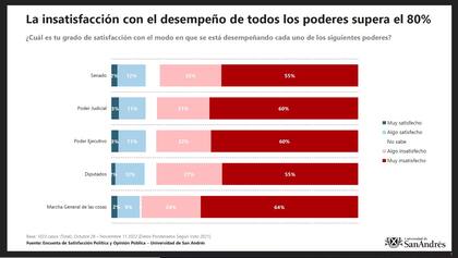 En la encuesta habla de la consideración que la gente tiene respecto de los poderes del Estado. La insatisfacción supera el 80% en todos los casos. El Senado: 55% de los consultados está muy insatisfecho, 25%, algo insatisfecho y solo el 14% está satisfecho. Con el Poder Judicial la misma situación: satisfacción del 14%, insatisfacción del 60%. Igual con el Poder Ejecutivo: 14% de satisfacción, más del 60% de insatisfacción absoluta. También con la Cámara de Diputados.