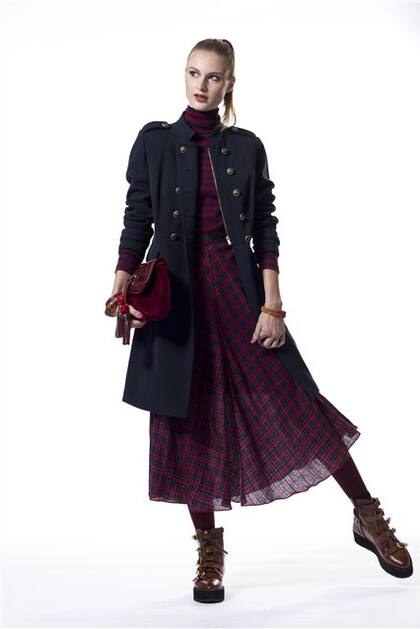 Tapado (Basement, $ 999), polera rayada (Tommy Hilfiger, $ 616), falda plato escocesa (Graciela Naum, $ 868), botas de cuero con herrajes (Huija, $ 1290), sobre de cuero con cuentas (De María, $ 880), pulseras multicolor (Indian Style, $ 95 c/u)