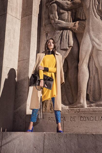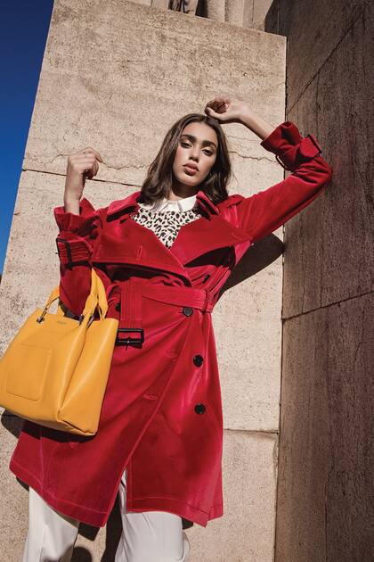 Remera de algodón animal print (Levi's), camisa y pantalón (Giesso), trench de pana con volados y mangas desmontables (Perramus), cartera (Blaqué)