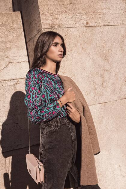 Buzo de seda estampada (Vitamina), tapado de lana (Mishka), jeans boyfriends (Levi's), minicartera con cadena (Lazaro), pulsera de oro rosa (Pandora)