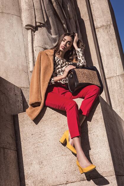 Remera animal print y tapado símil piel (Paula Cahen d'Anvers), pantalón de pana (Giesso), zapatos de gamuza (Prüne), cartera de cuero y piel (Blaquè)