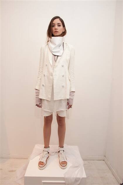Morfología: líneas envolventes, pero con recortes geométricos. Con recursos de ensamble, superposición y volumen, mostró su versión de la falda portafolio larga y tricolor, y otra a la rodilla, pantalón recto, ajustado y ancho, más blazers con cuellos y solapas fuera de lugar.