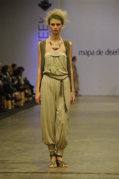el desarrollo de tejidos ecológicos que logran las prendas fluidas y frescas de Anabella Oviedo. Sumó con sandalias con tiras de chaguar de comunidades wichi del Impenetrable, presentadas por Chacú.