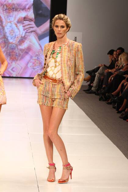 Materiales: camisolas en telas livianas sobre trajes de baño con aplique de foil y bordados. Gabardinas y linos intervenidos, y una línea recta, que incluye faldas tubo y el smoking de los 80.