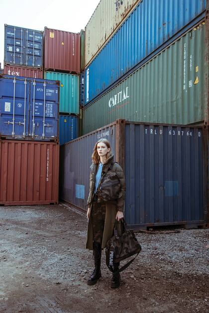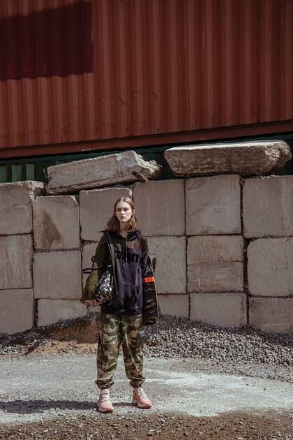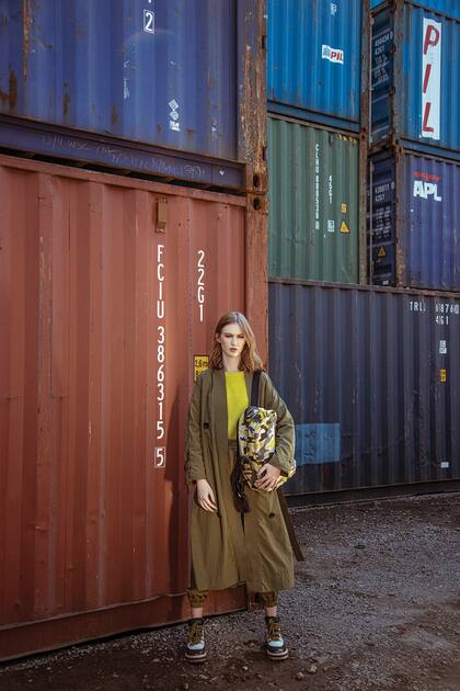 Suéter tejido, trench y pantalón, Mishka, borceguíes, Prüne, mochila camuflada, Bensimon