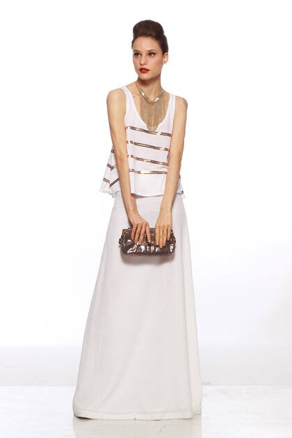 Musculosa blanca de algodón pima con detalles de lentejuelas y maxi falda de guipur (Etiqueta Negra, $ 470 y 850), collar de cadenas y strass (Luna Garzón, $ 360), cartera símil reptil con detalle de piedra (Prüne, $ 369)