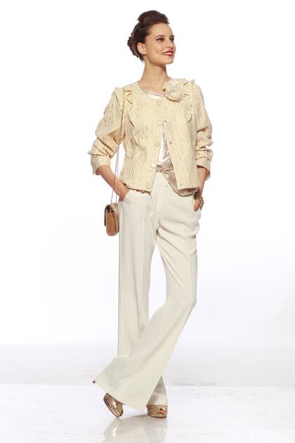 Top dorado y pantalón palazzo de seda (Cacharel, $ 495 y 1190), chaqueta de tweed con volados (Jazmín Chebar, $ 2250), broche de flor de tela y pulsera de strass (Las Juanas, $ 220 y 420), cartera de gamuza (Josefina Ferroni, $ 760), stilettos (Santesteban, $ 2004)