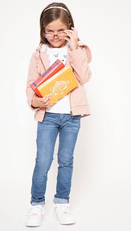 LADY LIKE. Buzo con capucha, remera manga larga con estampa, pantalón denim elastizado, (Wanama Boys & Girls, $ 1188, $ 389 y $ 989), zapatillas skate (Atomik, $ 769) y anteojos de lectura (Infinit, $ 2500)