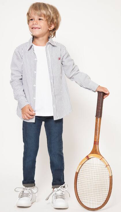 CLÁSICO. Camisa rayada, remera de algodón manga larga, pantalón de jean elastizado (Broer, $ 689, $ $ 269 y $ 769) y zapatillas de cuero (Kickers en Grimoldi, $ 750)