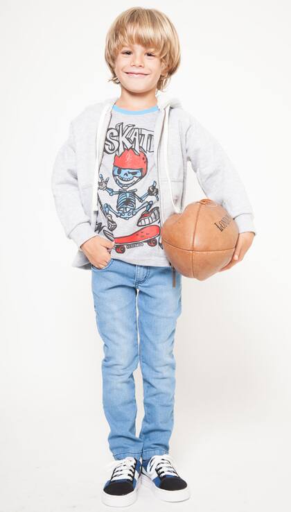 DEPORTIVO. Buzo con capucha, remera manga larga con estampa, pantalón denim, (Grisino, $ 879, $ 399, $ 749), zapatillas combinadas (Toot, $ 348)