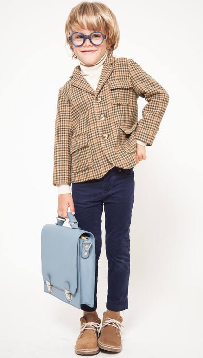 BRITISH. Saco cuadrillé, polera lisa, pantalón de corderoy elastizado, (Paula Cahen d’ Anvers Niños, $ 1376, $ 806, $ 906), botitas de gamuza (Cheeky, $ 828), anteojos de lectura (Infinit, $ 2300) y maletín de cuero (Gorrión, $ 2550)