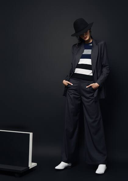 Traje de blazer clásico y palazzo sastrero, Naíma; suéter de lana, Paula Cahen d'Anvers; botas, Blaquè