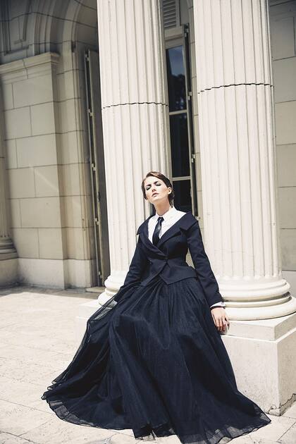 Javier Saiach (der). Vestido en tul bordado a mano con hilos de seda natural, canutillos y bordes calados con motivos florales y campera de cuero con bordado artesanal de flores aplicadas en volumen