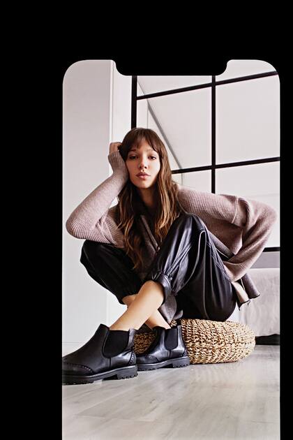 Bufanda estampada, Mishka; suéter de lana, Giesso; pantalón de cuero con puño en el tobillo y botas de cuero, Etiqueta Negra