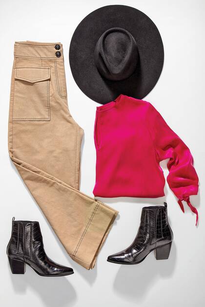 Pantalón de tiro alto de gabardina con bolsillos y pespuntes, Cibeles. Sombrero de fieltro, Vitamina. Blusa de seda lavada, Giesso. Botas cortas, Mishka