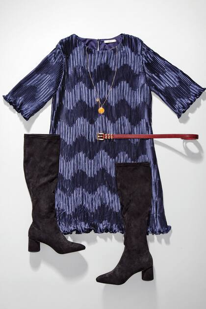 Vestido de satin plisado, Uma. Colgante con dijes, Vitamina. Cinturón de cuero grabado, Giesso. Botas altas de gamuza, Prüne
