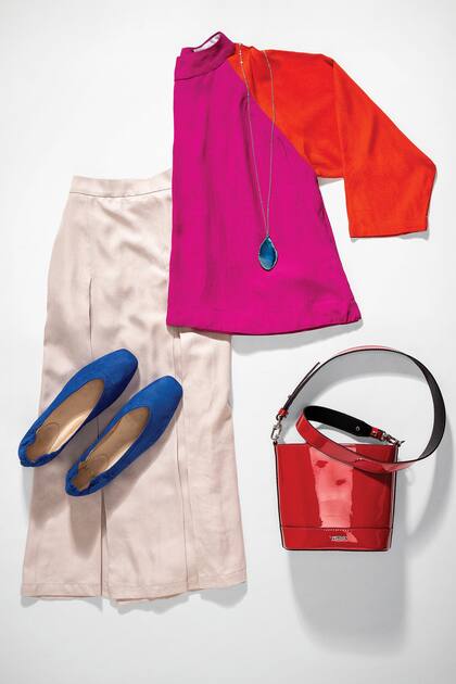 Blusa de crepe combinada, pollera pantalón tableada y ballerinas de gamuza, Mishka. Colgante con piedra, Vitamina. Cartera de charol, Prüne