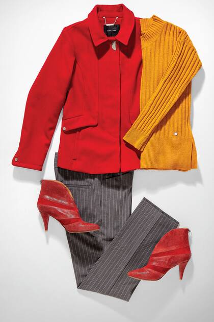 Gabán de paño y suéter de lana acanalada, Perramus. Pantalón tizado, Vitamina. Botinetas de cuero y gamuza combinados Uma
