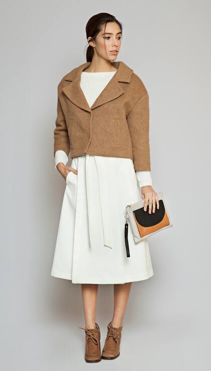 Sin talón: Sobre con recortes y correa demontable (a pie en Grimoldi, $ 2600), modelo símil zuecos (Mishka, $ 4120), tapado de corderito gamulán (Uma, $ 13.500), remera (Anónimas, $ 834), pantalón crepé y bufanda de baby alpaca (Clara, $ 1300 y $ 1320)